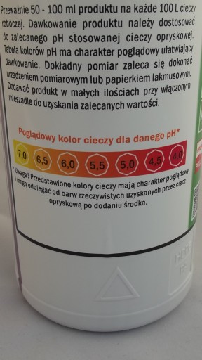 ZASTOSOWANIE Adiuwant regulator odczynu pH cieczy roboczej agrochemikaliów.Płyn wzbogacony jest o niejonowy surfaktant który ułatwia, poprawia wnikanie cieczy, powoduje równomierne pokrycie liścia i zapobiega spływaniu cieczy opryskowejprzez co intensyfikuje działanie substancji czynnych.Skutecznie neutralizuje jony żelaza, magnezu, wapnia przez co zabezpiecza substancje czynne przed szkodliwym działaniem związków występujących w wodzie.Płyn posiada indykator, wskaźnik koloru pH cieczy co ułatwia stosowanie produktupoprzez zmianę koloru cieczy zgodnie z tabelą umieszczoną na opakowaniu.Zapobiega krystalizacji w zbiorniku, przewodach i dyszach opryskiwacza. PRZYGOTOWANIE ŚRODKA Produkt jest koncentratem,dodatkiem do cieczy opryskowej ZUŻYCIE Przeważnie od 50 do 100ml ma każde 100 litrów cieczy w zależności od użytego środka i pożądanego pH cieczy opryskowej SPOSÓB UŻYCIA Dodawać płyn w małych dawkach przy włączonym mieszadle obserwując ciecz i porównując ze skalą na opakowaniu. Ostatecznego pomiaru dokonać papierkiem lakmusowym lub urządzeniem pomiarowym. ŚRODKI OSTROŻNOŚCI W trakcie pracy nie jeść, nie pić, nie palić tytoniu. Nie wdychać oparówcieczy, nosić odzież ochronną, zapoznać się z kartą charakterystyki produktu. Po pracy umyć dokładnie ręce wodą z mydłem. OKRES WAŻNOŚCI Dwa lata od daty podanej na opakowaniu. PRZECHOWYWANIE Przechowywać w oryginalnych i szczelnie zamkniętych opakowaniach z widoczną etykietą w temperaturze od +50C do 400C. OCHRONA ŚRODOWISKA Produkt ulega biodegradacji i nie ulega biokumulacji. DANE TECHNICZNE Konsystencja -cieczRozpuszczalność-bez ograniczeńProdukt niepalny.