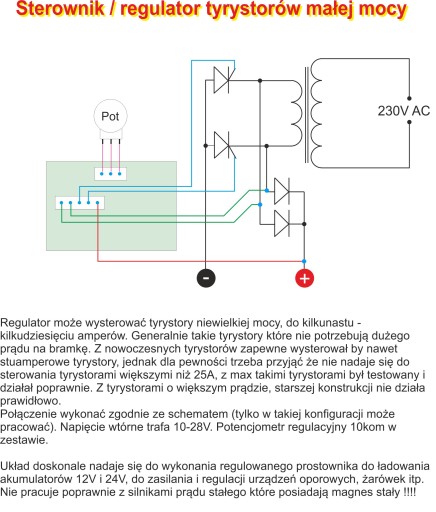 Jest to sterownik dwóch tyrystorów małej mocy. Jeśli zastosujemy nowoczesne tyrystory z małym prądem bramki, układ powinien wysterować nawet tyrystory 50A, w przypadku tyrystorów starego typu z dużym prądem bramki - układ raczej nie wysteruje tyrystorów o prądzie większym niż 25A, aczkolwiek można spróbować. Układ umożliwia płynna regulację prądu ładowania akumulatora. Do zbudowania prostownika potrzebny jest transformator o napięciu około 15-18V oraz mostek diodowo-tyrystorowy - 2 diody mocy i 2 tyrystory.