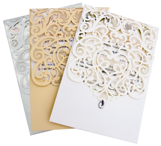 Wyjątkowe zaproszenia wycinane laserowo wykonane z papieru perłowego.