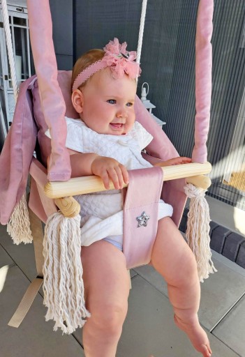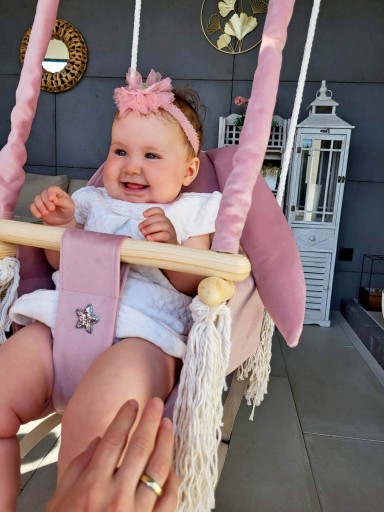 Huśtawka wykonana z delikatnego aksamitno pluszowego materiału, który jest bardzo miękki i delikatny w dotyku oraz bardzo wytrzymały.