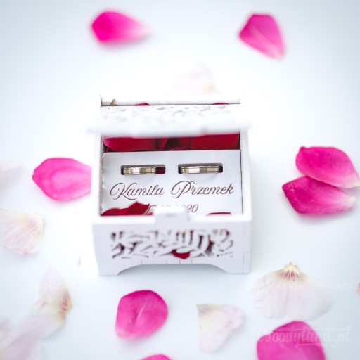 - Pudełko wspaniale posłuży podczas ceremonii ślubnej i pozwoli w efektowny sposób podać obrączki