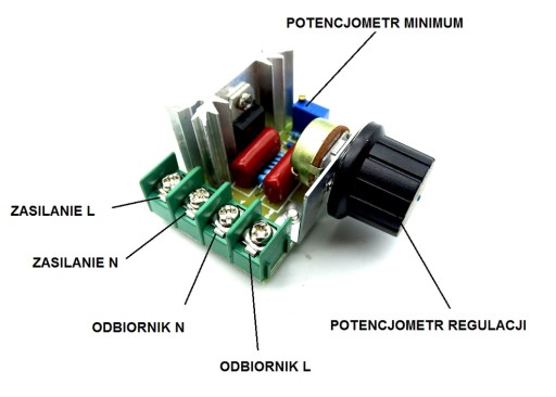 Kompletny i gotowy do użycia moduł regulatora obrotów, napięcia oraz mocy. Posiada potencjometr na przewodzie dzięki czemu w łatwy sposób można go zamontować w obudowie.