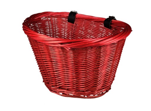 Красная плетеная корзина, скрепленная ремнями.