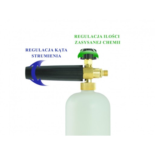 Ponadto pianownica posiada regulację kąta strumienia. Dzięki temu można uzyskać bardzo szeroki strumień, idealny do mycia dużych powierzchni lub wąski strumień do precyzyjnego mycia niewielkich detali. Natomiast możliwość ustawienia ilości zasysanej chemii pozwala zoptymalizować gęstość piany w zależności od potrzeb oraz właściwości używanych preparatów.