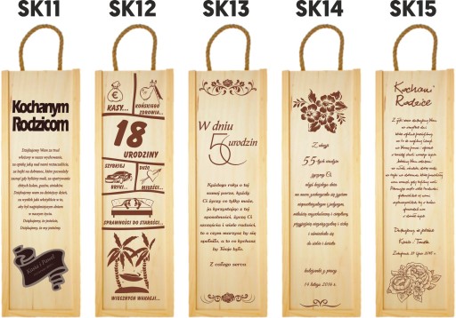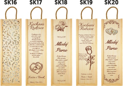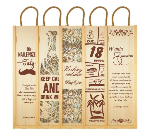 Skrzynka drewniana na butelkę wina lub innego alkoholu z grawerowanym zasuwanym wiekiem. Pudełko posiada wycięcie ażurowe (na wylot) oryginalne okienko przez, które widoczna jest zamknięta w środku butelka ulubionego trunku. Skrzynka z surowego drewna niemalowana, niebejcowana. Ozdobiona grubym sznurkiem. Każda skrzynka wypełniona jest wełną drzewną gratis.