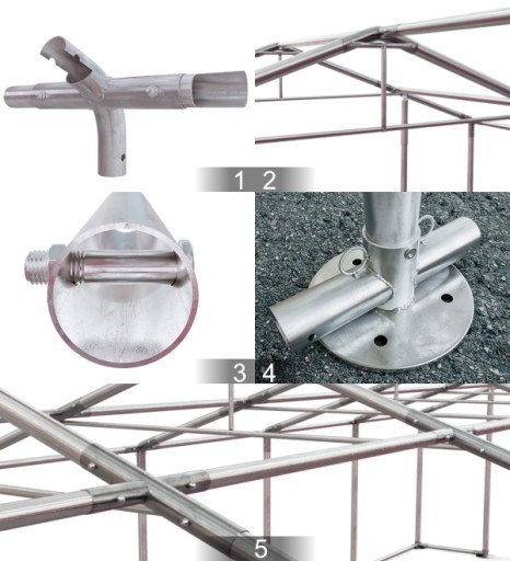Stosujemy stal zabezpieczoną ocynkiem. Zapewnia to ochronę przed korozją i gwarantuję wieloletnią eksploatację. Rury nośne posiadają średnicę fi ok. 50 mm, a łączniki fi ok. 54 mm