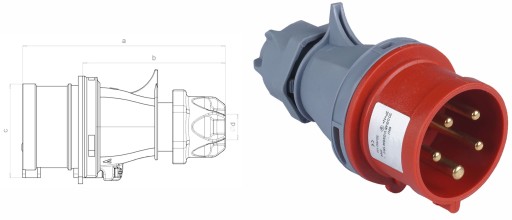 Wtyk jest 5-biegunowy. Maksymalne obsługiwane napięcie to 400V, a prąd znamionowy wynosi 32A. Produkt jest barwy szaro- czerwonej i zapewnia stopień ochrony na poziomie IP44. Styki wykonane są z mosiądzu.