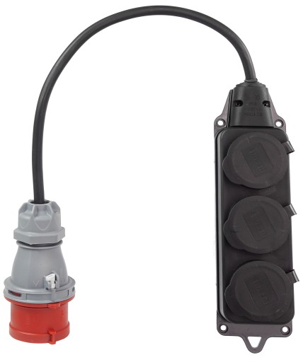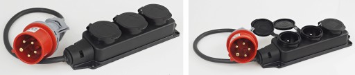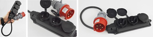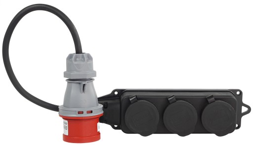 Adapter rozgałęźnika gumowego, przejściówka, przenośna, z wtyczki 32A 5P na trójnik 3x230V 16A.