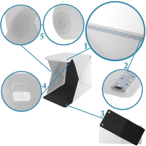 Bezcieniowy namiot fotograficzny z 20 diodami LED. Szybki montaż pozwala nam stworzyć efektywne, mobilne mini studio do fotografii produktowej.