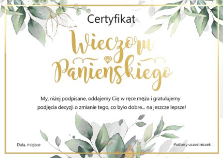 - Certyfikat na pamiątkę wieczoru panieńskiego