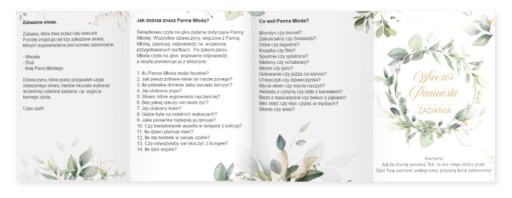 - Zestaw zadań na Wieczór Panieński w wygodnej formie, rozkładanej broszury. W przeciwieństwie do pojedynczych kart unikniesz ryzyka rozsypania zadań w torebce czy pod stołem.