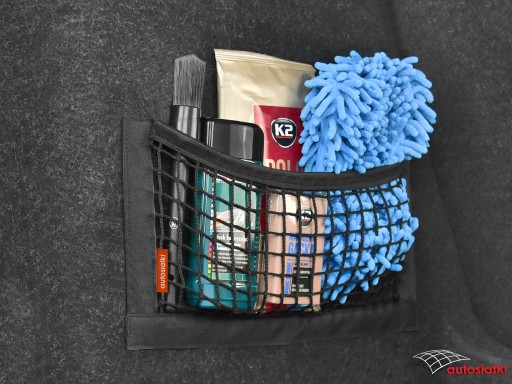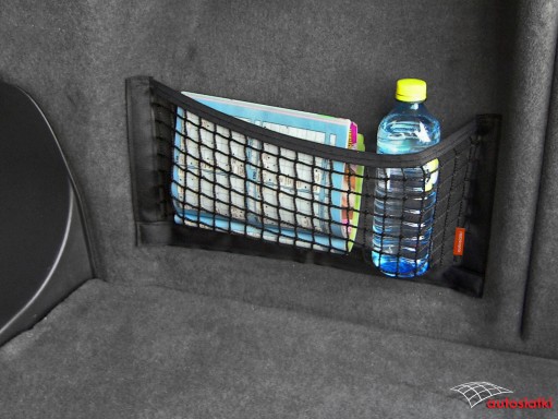 To wytrzymała siatka obszyta od dołu i po bokach taśmą typu rzep. Od góry wykończona gumą, która zabezpiecza i chroni akcesoria przed przemieszczaniem. Kieszeń mocuje się do wykładziny w bagażniku lub kabinie auta.