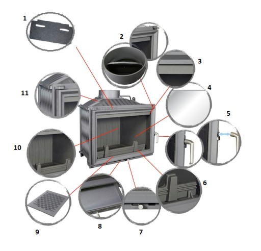 11. Materiał: żeliwo - wytrzymałe, długo utrzymujące temperaturę. Ścianki paleniska o minimalnej grubości 8mm gwarantują bezawaryjne działanie paleniska. Gęsto rozmieszczone radiatory - dzięki nim kominek przekazuje więcej ciepła do otoczenia.