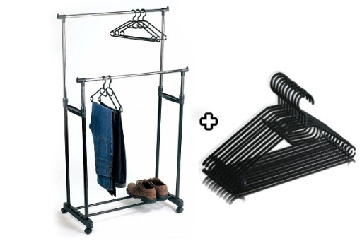 Proponujemy Państwu bardzo lekki i stabilny, podwójny wieszak na ubrania z regulowaną wysokością wykonany z metalu. Do jego zalet należy to, że posiada regulowaną wysokość i jest na kółkach co umożliwia łatwe przesuwanie.