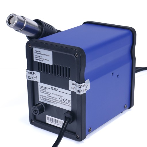 Przy pierwszym uruchomieniu proszę umieścić kolbę gorącego powietrza na podstawce. Po ustawieniu temperatury podnieść kolbę. W podstawce jest mikrostyk.