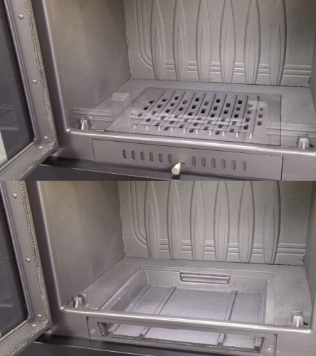 Szuflada/pojemnik na popiół, w których gromadzą się pozostałości po spalonym drewnie oraz ruchomy ruszt, ułatwiający usunięcie popiołu.