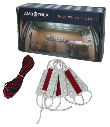 Oświetlenie samochodowe wnętrza Ambother - zestaw paneli z diodami LED (10x3 diody). Przeznaczony do zastosowania w samochodach osobowych, dostawczych oraz ciężarowych, camperów, przyczep kempingowych itp. Łatwy do zamontowania - panele przyklejane na taśmie dwustronnej. Świetnie doświetla kabiny i wnętrza samochodów.