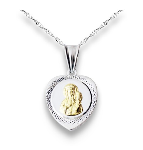 Elegancki medalik z figurką Matki Boskiej w serduszku
