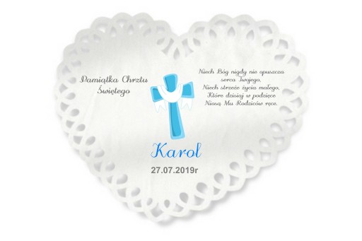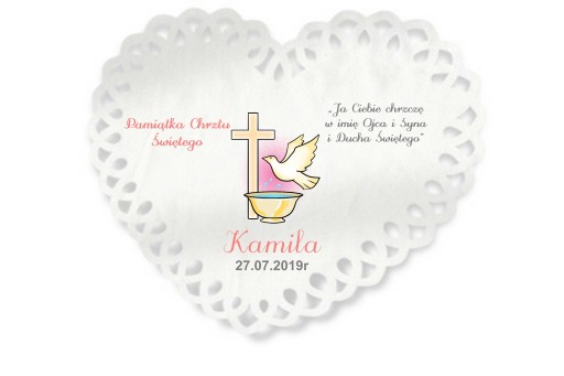 Szatka- delikatna biała szatką z pięknym wzorem. Materiał szatki to 75% satyna 25% poliester. Świetnie nadająca się pod nadruk. Do wyboru na aukcjach są różne wzory- kształty. Na szatce może umieścić wybrany motyw, dedykację, imiona dziecka, datę. Wszystko zgodne z Państwa instrukcją i życzeniem.