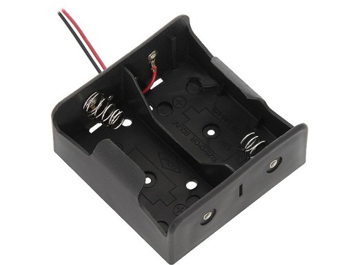 PODSTAWKA KOSZYK NA DWIE BATERIE TYP R20 KOLOR PODSTAWKI -CZARNY ROZMIAR69X69X32mm WYPROWADZONE PRZEWODY CZARNY+CZERWONY DŁUGOŚĆ PRZEWODÓW 12cm
