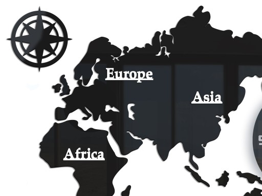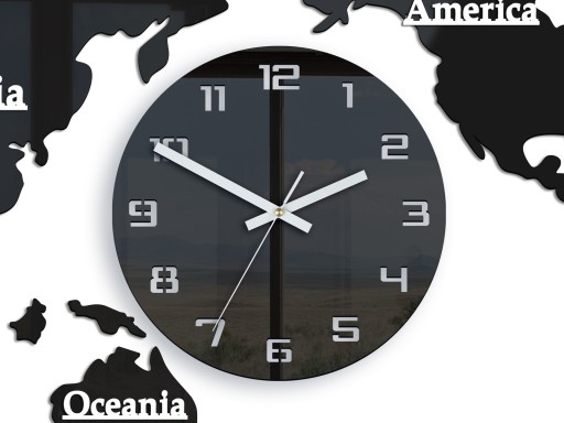 Wyjątkowy i nowoczesny zegar ścienny. Jego prostota i piękno urzeka każdego kto na niego spojrzy.Kontynenty wykonane są z czarnego błyszczącego szkła akrylowego. Idealnie komponuje się w każdym wnętrzu, to nie tylko zegar ale piękna ozdoba Twojego salonu, pokoju, czy też biura. Idealnie nadaje się na prezent..