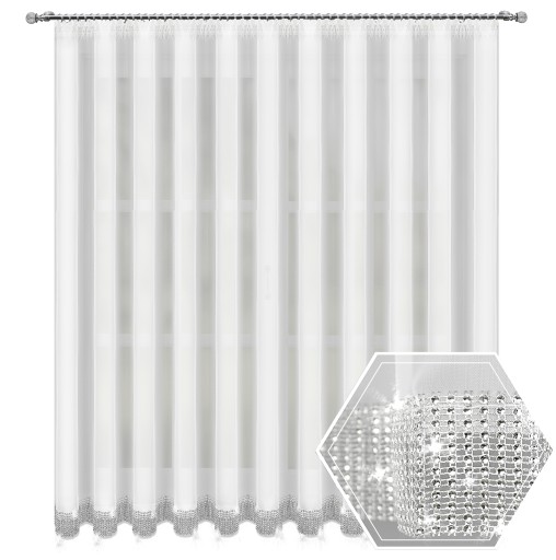 Wychodząc naprzeciw oczekiwaniom naszych klientów oferujemy gotową do powieszenia, efektowną firanę z białego woalu wykończoną pasem cyrkonii, które odbijają światło, dodając firanie blasku i błysku.