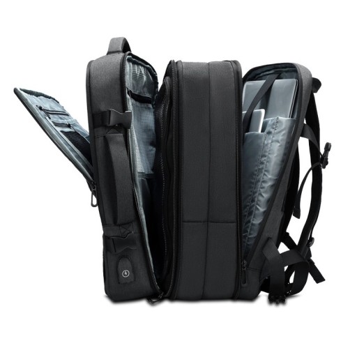 Plecak jest bardzo pojemny. Posiada łącznie 3 komory. Pierwsza to komora z organizerem (może schować do niej komórkę, myszkę, długopisy itd.), druga to komora na ubrania, w trzeciej zmieści się laptop do 17,3" oraz tablet 10".