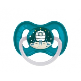Wysokiej jakości, kauczukowy (lateksowy) smoczek do uspokajania wyposażony został w gumkę o kształcie okrągłym oraz w tarczkę o kształcie tradycyjnym. Smoczek dobrze odpowietrza się. Dodatkowo uchwyt smoczka świeci w ciemności, ułatwiając znalezienie smoczka w nocy.