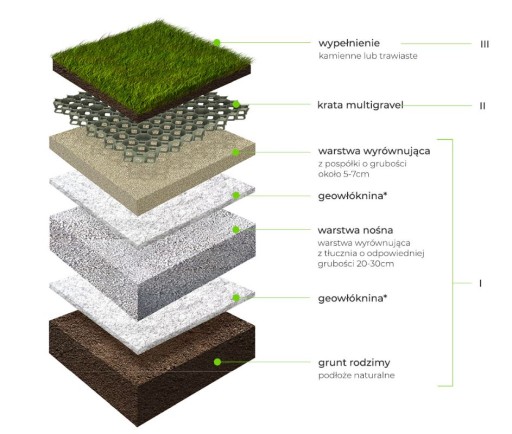 - od 20 do 30 cm dla lekkiego ruchu kołowego - samochody osobowe, ruch pieszy, ścieżki, itp. Opcjonalnie można zastosować geowłókninę dla oddzielenia warstwy nośnej z warstwą wyrównującą, zapobiegnie ona przemieszaniu się warstw podbudowy. Następnie wykonujemy warstwę wyrównującą z pospółki/piasku z drobnym żwirem o grubości około 5-7cm.