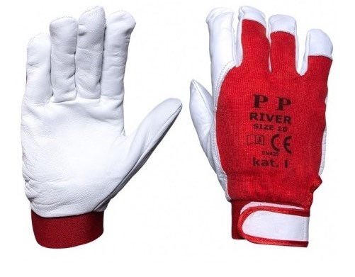 Rękawice robocze, ochronne, wykonane z wysokiej jakości skóry koziej, licowej. Całodłonicowe, w części chwytnej w kolorze jasnym. Wierzch wykonany jest z elastycznej tkaniny w kolorze czerwonym na rzep.