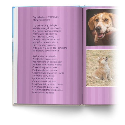 Powyżej pisałem, że w książce można umieścić bardzo wiele zdjęć. Tak naprawdę jednak najlepiej wyglądają zdjęcia bardzo duże, najlepiej na całą stronę. W większości naszych projektów są one układane właśnie w taki sposób. Przeczytaj więcej w opisach poszczególnych projektów.