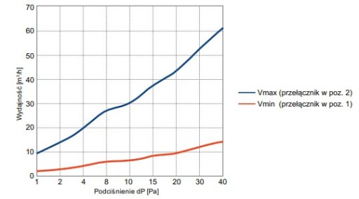 - Dla dP= 10 Pa wydajność wynosi 30 m³/h;