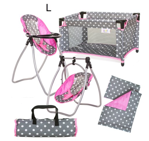 Zestaw marki DORIS, który bardzo realistycznie odzwierciedla prawdziwe łóżeczko turystyczne oraz krzesełko dla dziecka. Posiada wiele funkcji i możliwości różnorodnej zabawy.