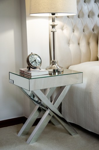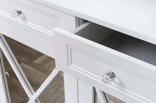 Boki pełne na całą głębokość blatu, o szerokości 6,5 cm, wykończone są tylko lustrem kryształowym. Konstrukcja blatu obiera się na pełnych bokach. Ma on grubość 6,5 cm i także wykończony jest lustrem kryształowym. Pod blatem umieszczono dwie symetryczne szuflady wykończone lustrem kryształowym, do których na środku przymocowane są gałki kryształowe. Szuflady wysokie są na 12 cm i szerokie na 32 cm, przy całkowitej szerokości toaletki 80 cm. Szuflady na życzenie klienta mogą zostać wykończone wewnątrz skórą. Toaletka jest stabilnym, ultranowoczesnym wyrobem, zaprojektowanym w idealnych proporcjach.