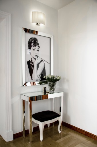 Toaletka lustrzana LONG ISLAND jest jednym z wyrobów kolekcji, która stała się wręcz autorska linią, zaprojektowaną na potrzeby jednej z naszych klientek, i zyskała sobie ogromną popularność. Cała kolekcja jest niezwykle minimalistyczna, wręcz ultranowoczesna. Priorytetem stało się stworzenie niezwykle wyraźnej formy, od frontu definiowanej liniami prostymi i dopełnionej dwiema symetrycznymi szufladami. Cechą charakterystyczną KOLEKCJI LONG ISLAND są pełne boki na szerokość blatu, które go podtrzymują. Z frontu widoczna jest jednoznaczna szerokość boków i blatu, nakreślająca dwie równe pionowe linie, na których wspiera się konstrukcja pozioma, bez żadnych wystających rantów. Dzięki temu zabiegowi meble z KOLEKCJI LONG ISLAND mogą być bardzo dużych rozmiarów, a przy tym są stabilne i bezpieczne. Boki, chociaż obszerne, odbijają przestrzeń i powiększają wnętrz, co sprawia materiał wykończeniowy – lustro kryształowe. Jedynym elementem dekoracyjnym w tej kolekcji są gałki kryształowe, które na życzenie klienta mogą zostać zamienione na system TIP-ON firmy GRASS HOPPER, tak, by szuflada otwierała się za dotknięciem palca. Wtedy wyrób zyskuje całkowicie modernistyczny wygląd.