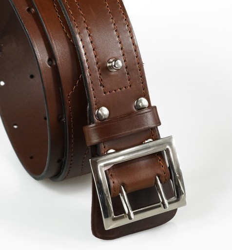 Dwurzędowa klamra zamontowana jest do pasa przy pomocy nitów co sprawia, że jest trwała i stabilna. Pas posiada dodatkowy bolec co daje mocne zapięcie. Pas w komplecie posiada dwie bojówki (zawieszki).