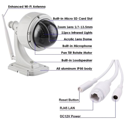 Obrotowa kamera wyposażona została w funkcję Pan-Tilt-Zoom (PTZ), przez co możliwe jest dobranie odpowiedniego do wymagań położenia kamery oraz przybliżanie obrazu. Zmienna ogniskowa w zakresie 3,3 - 12 mm pozwala na osiągnięcie 5 krotnego zoomu optycznego. Dzięki temu osiągamy zmienny kąt widzenia kamery od 40 do 125 stopni po przekątnej.