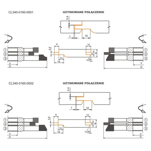 - 1 sztuka indeksu, np. CL340-0160-0001 zawiera zestaw frezów do wykonywania pióra i zestaw frezów do wpustów
