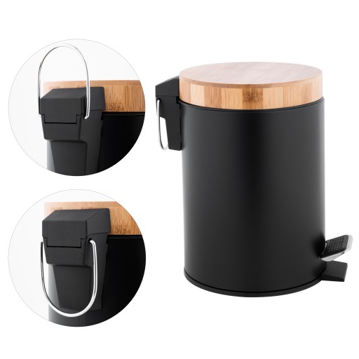Kosz łazienkowy wykonany ze stali malowanej proszkowo oraz naturalnego drewna bambusowego. Pojemnik o idealnie gładkim, matowym wykończeniu.
