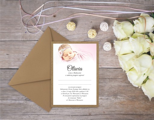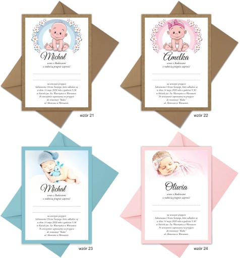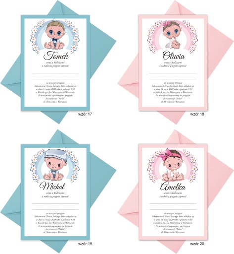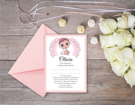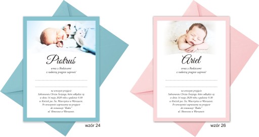 Zaproszenia na chrzest w formacie 10,5 x 14,5 cm wykonujemy na dwóch kartach papieru: podkładu w trzech kolorach do wyboru (eko, niebieski, różowy) oraz koloru białego + koperta w kolorze pasującym do podkładu (eko, niebieska, różowa).