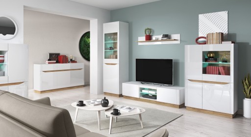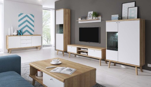 Hit ! Meblościanka OMIRO 1 wykonana z wysokiej jakości płyty laminowanej. Meble wykonane w stylu skandynawskim co znacznie je odróżnia od pozostałych produktów. głównym atutem zestawu jest masywna konstrukcja która wbrew pozorom naprawdę stabilnie stoi na ziemi. Listwy wykańczające wykonane są z MDFu. Każdy element dokładnie oklejony okleiną ABS. Dodatkowym atutem niewątpliwie jest oświetlenie LED które robi niezwykłe wrażenie zwłaszcza wieczorami. Tak wykonany zestaw posłuży przez wiele lat.