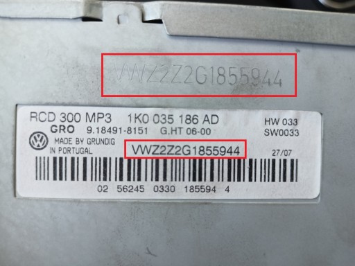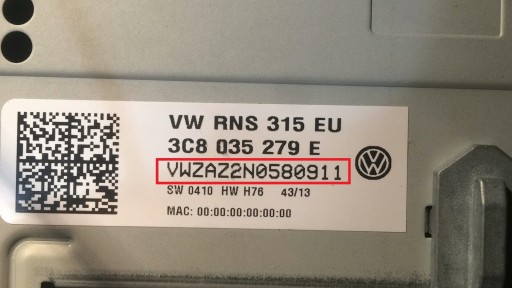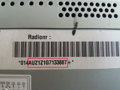 Numer seryjny radia rozpoczyna się od liter VWZ..., AUZ..., ciąg 14 znaków, znajduje się na obudowie radia, należy wyciągnąć radio i odczytać go z naklejki lub graweru na obudowie radia: