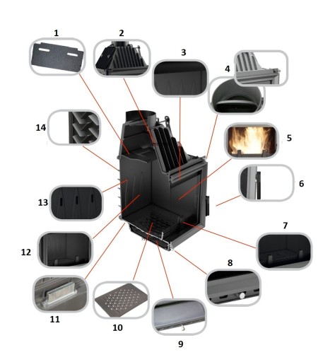 - Ścianki paleniska o minimalnej grubości 8mm - gwarantują bezawaryjne działanie paleniska. Gęsto rozmieszczone radiatory - dzięki nim kominek przekazuje więcej ciepła do otoczenia. Materiał żeliwo szare - wytrzymałe, długo utrzymujące temperaturę