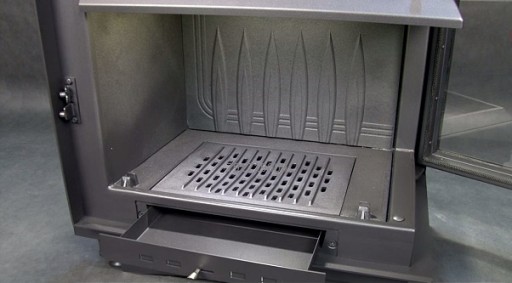 Szuflada/pojemnik na popiół, w których gromadzą się pozostałości po spalonym drewnie oraz ruchomy ruszt, ułatwiający usunięcie popiołu.