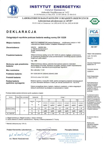 Sprawozdanie z badań według normy PN/EN 13229 potwierdzające spełnienie niemieckiej normy BImSchV Stufe 2 oraz austriackiej Art. 15a B-VG