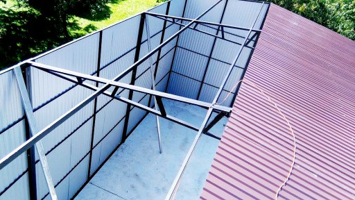 Konstrukcja garażu jest wykonana z profili zamkniętych, ceownika i kątownika zimno-giętego, pomalowanego farbą podkładową.