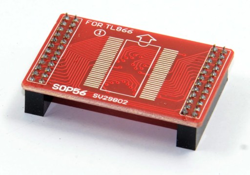 Adapter SN:005 przeznaczony do programatorów TL866A, oraz TL866CS. Umożliwia programowanie układów w obudowach SOP56. Wersja do lutowania. Układ (pamięć) należy przylutować do płytki drukowanej adaptera w celu jego zaprogramowania.