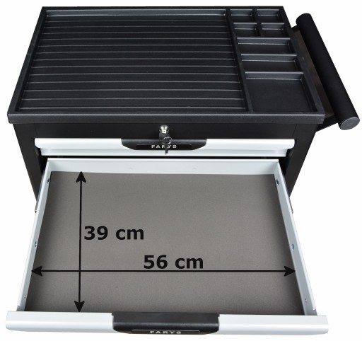Szafka wykonana z trwałych i solidnych materiałów, gwarantują one przyjemne i długie użytkowanie szafki nawet w warunkach warsztatowych. Posiada ona 4 kółka jezdne, zamek centralny oraz szuflady wyłożone pianką. Dodatkowo szafka została wyposażona w dwa hamulce umieszczone na kółkach szafki, które zapewniają że szafka nie przemieszcza się podczas pracy oraz umożliwia pracę nawet kiedy powierzchnia robocza jest pochylona.