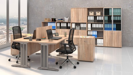System Biuro charakteryzuje się wysoką funkcjonalnością i estetyką. Meble wykonane są z najwyższej jakości materiałów zarówno polskich, jak i zagranicznych producentów. Do produkcji mebli biurowych używamy płyty meblowej laminowanej o grubości 18mm oraz 25mm (dla blatów). Krawędzie elementów oklejane są obrzeżem typu ABS o grubości odpowiednio 0,5mm oraz 2mm, w przypadku blatów.