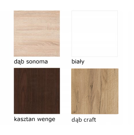 Meble z Systemu Biuro dostępne są w 4 podstawowych kolorach: dąb sonoma, biały, kasztan wenge, dąb craft. Poinformuj nas, jaki kolor wybierasz podczas zakupu.